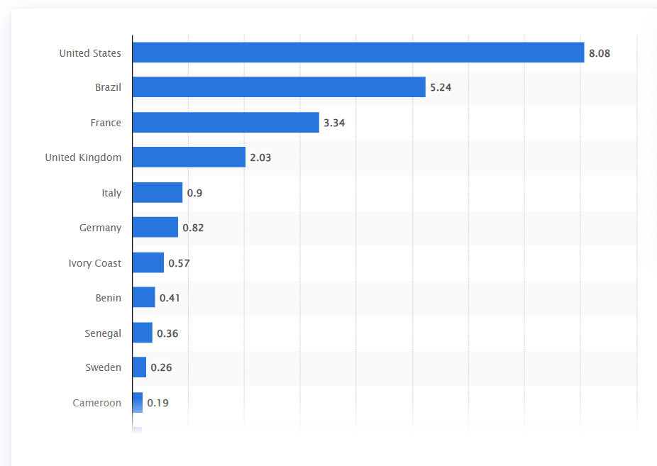 The United States is the country with the largest number of Spanish language students, with approximately 8.08 million people learning Spanish as a foreign or second language in 2022. Brazil is the second country with the largest number of Spanish language students, with around 5.24 million learners.